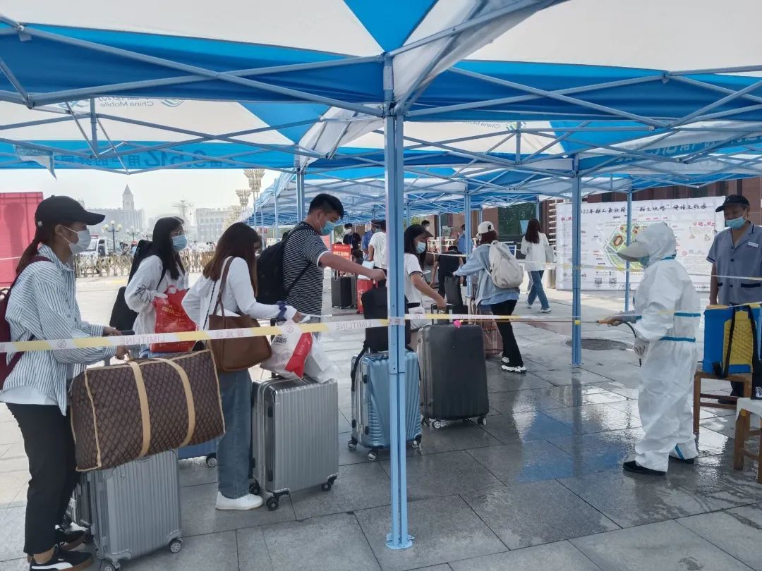 新生在校门口处扫描健康码,检查核酸检测结果无误后有序进入校园,并由防疫工作人员为其行李包消毒。
