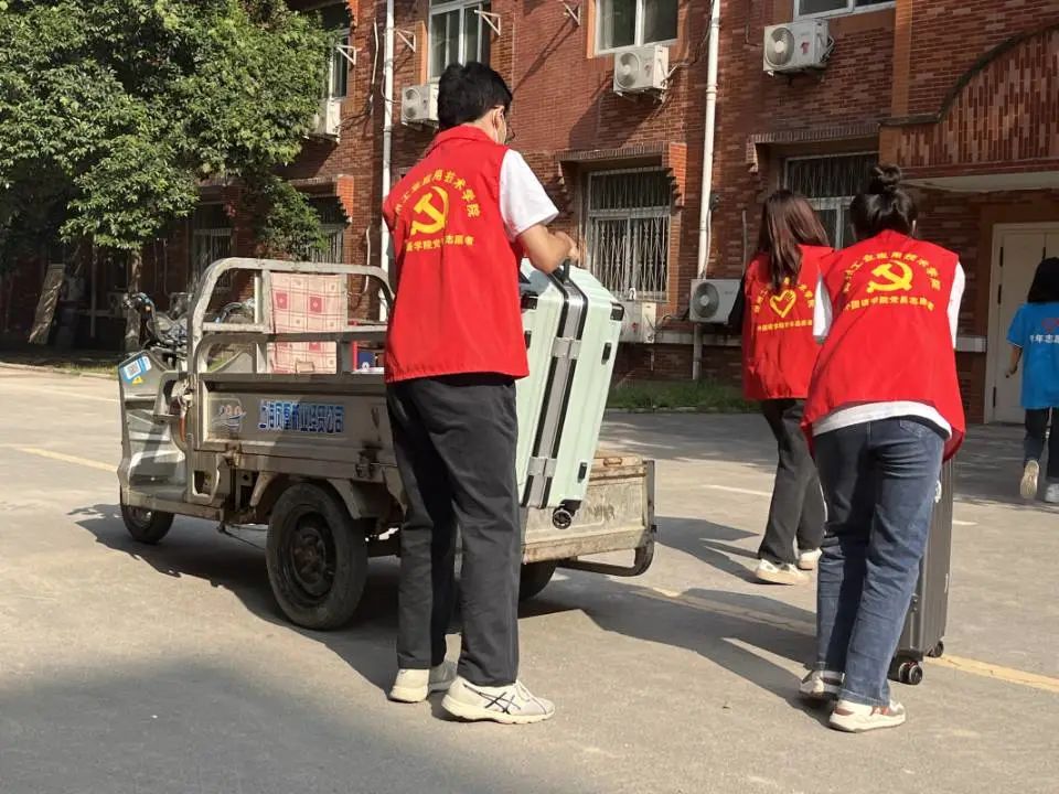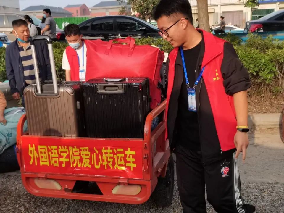 图为校外志愿者搬运行李