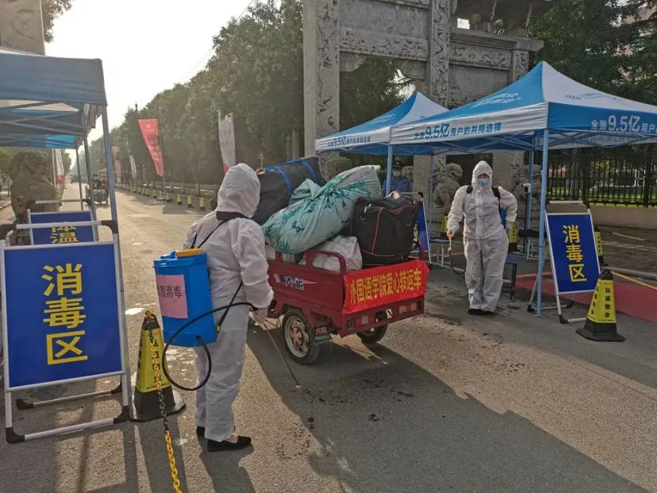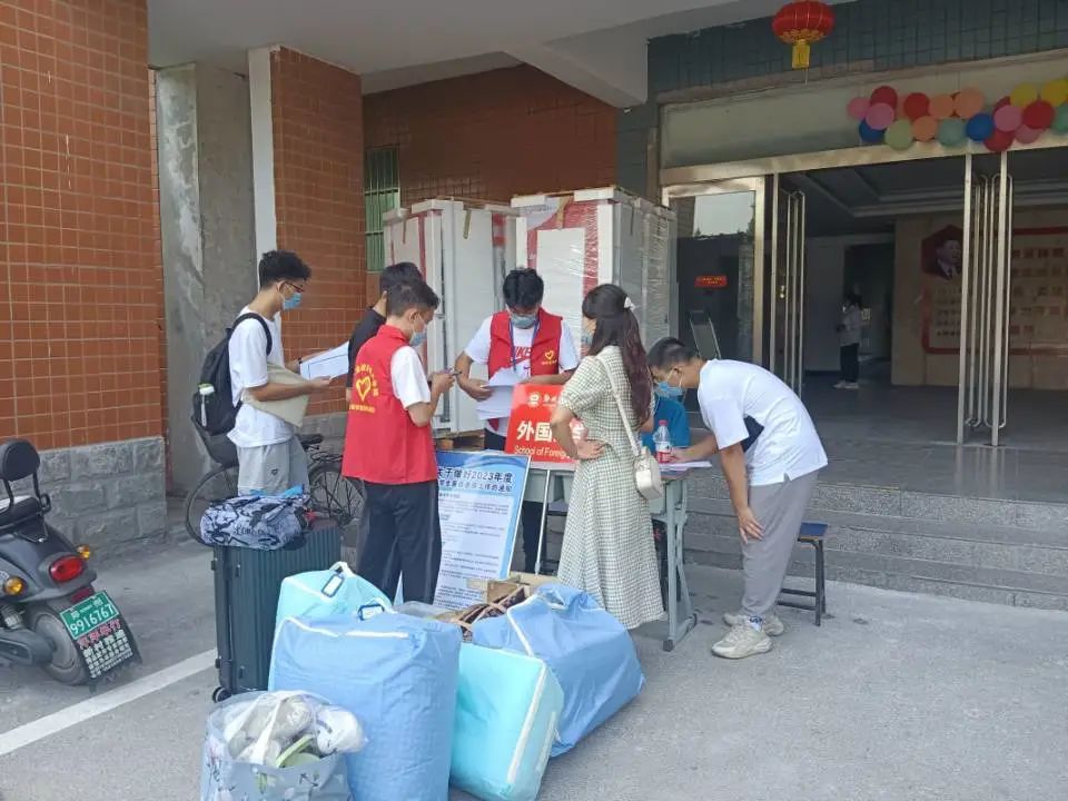 员工来到宿舍楼,由志愿者和宿管阿姨对新生的行李箱包进行再次消杀、为新生发放宿舍钥匙、空调钥匙等宿舍用品,帮助新生搬运行李上楼。