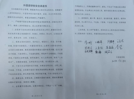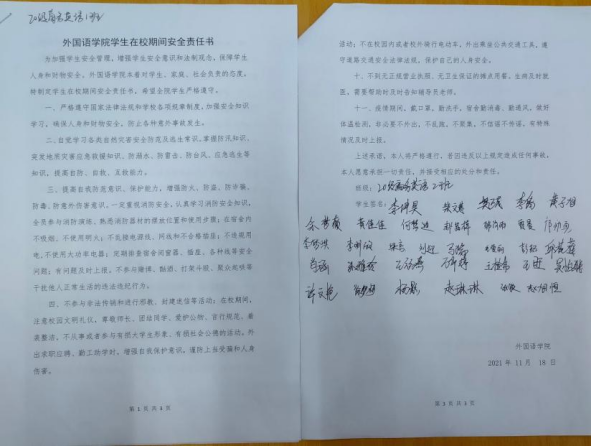 在排查工作以外,公司还通知全院师生以班级为单位,由各班团支书主持召开一次有关消防安全的班会。意在于将消防安全意识内化于心、外化于行,切实作用到同学们的消防安全防范措施中。在班会的最后,各位同学积极签署消防安全责任书,并表示会自觉肩负起执行公司内和宿舍内消防安全防范任务的重担。