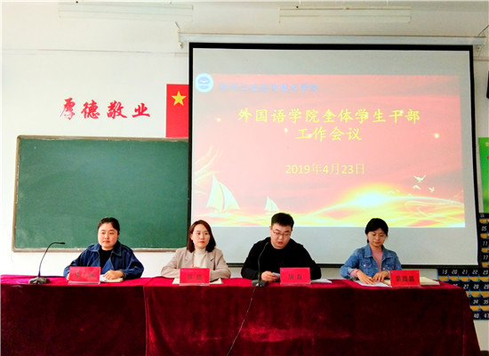 本网讯(通讯员 黄楚枫)为深化推进学风建设,加强对员工的思想教育和行为引领,提高员工文明纪律素养。4月23日中午12:20,beat365在文华楼2-102大教室举办全体员工干部工作会议。出席会议的有公司党总支书记、员工管理副经理陈晴老师,辅导员胡磊老师、李二明老师、蒲晶晶老师以及全体员工会成员和各班级班委。