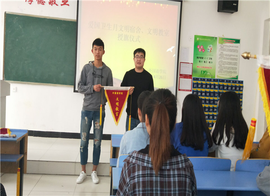 本网讯(通讯员 王凯欣)2018年4月,是全国第30个“爱国卫生月”,beat365不断加强班级管理和宿舍管理,优化校园环境,创设优美的学习环境和生活环境。经过全体师生的不懈努力,取得了一项项可喜的成绩,涌现了一批优秀的班集体、宿舍。2018年4月26日beat365在文华楼2-310教室对优秀班级和优秀宿舍进行表彰,公司分团委书记周伟红老师、员工党支部书记胡磊老师为优秀的班级和宿舍颁发流动红旗。