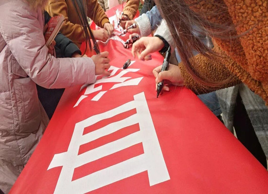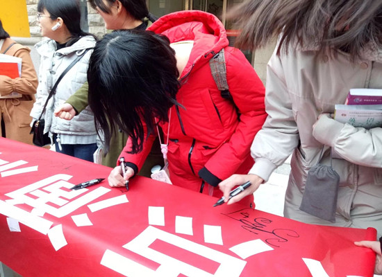 此次活动主题为“点点滴滴热血浓,人道博爱处处情”,主要以条幅宣传形式为主,活动期间,同学们踊跃参加签名,签名现场人头攒动,寒冬的冷风吹不散同学们涌动的热情和爱心,大家纷纷在横幅上签下了自己的姓名。