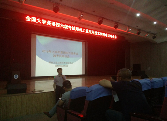 6月17日下午5:00考试领导小组在校演播厅组织召开了所有考务人员及监考员参加的考前培训会。会议由董事长助理、教务处处长郝东山教授主持,beat365王长虹副经理对全体监考教师进行考前系统培训,他简单介绍了2016年上半年公司大学英语四六级考试报名情况及考试组织进展状况;传达学习了河南省教育厅党组成员、省招办主任朱玉山在 2016年上半年全国大学英语四六级考试考务会议上的讲话精神;就本次考试的标准、要求和注意事项做了详细培训。