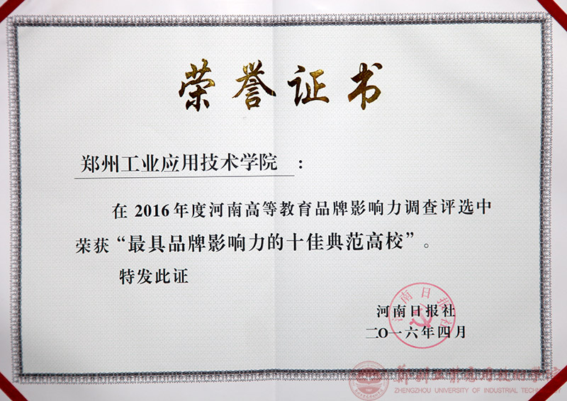 4月26日,由河南日报社主办的第七届河南高等教育创新典范高峰论坛在郑州举行,会议对2016年度河南高等教育品牌影响力调查推选活动中评选出的先进高校和先进人物进行了表彰。公司被评为“最具品牌影响力的十佳典范高校”荣誉称号。