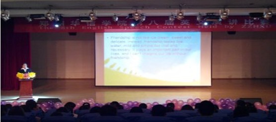 2014年4月3日晚18:30,郑州华信公司外语系在艺术楼演播厅举办了第八届英文演讲比赛。出席本次比赛的评委老师分别是:马利娜、王予红、娄晓超、吴方等。外语系主任、全体师生和部分选手的亲友团也都到场为选手们加油喝彩。