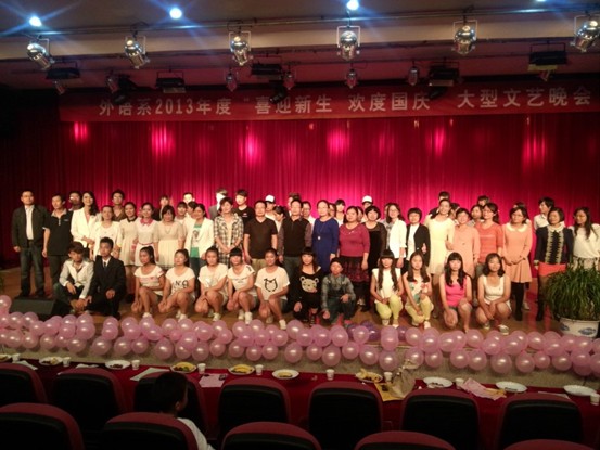 本次迎新生文艺晚会以“喜迎新生,欢度国庆”为主题,在动感的音乐声中拉开帷幕,外语系王长虹主任首先致开幕词。通过台下一次又一次的彩排,每位演员都呈现出最佳状态,每个节目都表现的恰到好处,给13级新生带去了温暖与感动,赢得台下观众阵阵掌声。演出结束后,所有演员与领导老师合影留念。