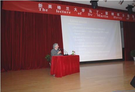 Dr.Martin Hovey博士向在座师生作了题为“Corporate Governance”的精彩报告,他首先通过与一个兄弟合伙开店的小故事切入主题,系统、深入地分析了美国模式、德国模式、亚洲模式、中国模式等四种主要公司治理模式,语言幽默而不失严谨,不时赢得在座师生的热烈掌声。报告会后,澳大利亚教育国际开发署负责人高勇先生详细介绍了公司与澳大利亚新英格兰大学(UNE)合作办学以及公司员工赴澳留学的相关情况,代表澳大利亚教育国际开发署欢迎同学们赴澳留学深造并愿意提供帮助。