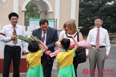 剑桥教学的小朋友向狄奥多西教授及夫人献花