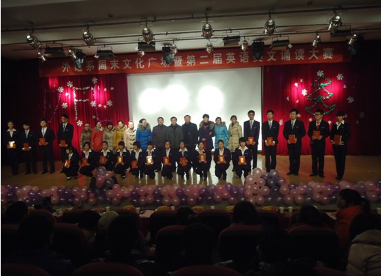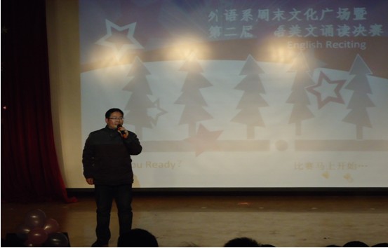 2012年12月30日晚7点,外语系周末文化广场暨第二届英语美文诵读决赛在艺术楼演播厅拉开帷幕。莅临本次大会的领导嘉宾有:员工处处长兼就业办主任赵科宁、外语系主任王长虹、外语系党总支副书记主任助理李爱萍、校团委郭鹏老师、商公司团总支书记王文娟老师、外语系全体师生以及校员工会各院系的员工干部代表。
