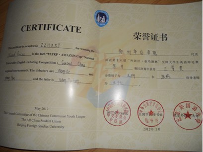 2012年5月18日至20日,第十六届“外研社· 亚马逊杯”全国老员工英语辩论赛华中赛区总决赛在华中师范大学顺利举行。经过全校范围的几轮选拔赛,郑州华信公司外语系派出王予红老师为领队,带领11级英语本科2班的张燕同学和11级电气1班的王珂同学参加了此次比赛。