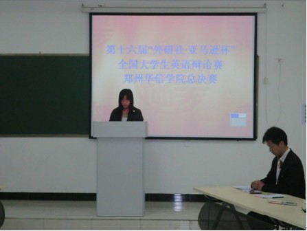 2012年4月24日晚上7:30,第十六届“外研社· 亚马逊杯”全国老员工英语辩论赛郑州华信公司总决赛在外语系218大教室拉开了帷幕。此次辩题为“Can People Make True Friends on the Internet”,该辩题较为贴近员工生活,适合比赛。此次参赛的辩手分别为:王珂、张燕、张波、王海云、杜猛、柴超阳、王晓阳、王婷婷八名同学,辩论赛主席为石梦可同学。评委老师总共有五位,均为外语系资深教师。此次辩论赛以主席充满激情的致辞开场,八位辩手声情并茂,慷慨激昂地发表各自的见解。尤其是最后的自由提问环节,各位辩手唇枪舌战、不甘示弱,都表现出了最佳的状态。最后,由外语系常玉洁老师为此次比赛进行点评,常老师指出,此次比赛选手们准备充分,反应敏捷,都发挥出了最佳水平,但是也有一些不足之处,需要同学们以后多加注意并改进。