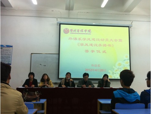 为营造优良学风,构建和谐校园环境,促使同学们自觉树立“学风建设,从我做起”的意识。外语系组织全体员工于4月20日晚6点在文华楼(2)阶四大教室举办“外语系学风建设动员大会暨《学风建设承诺书》签字仪式”。参加本次会议的领导、老师分别是:外语系党总支副书记、主任助理李爱萍老师,外语系教学秘书张敏老师、外语系专业英语教研室主任许东阳老师、外语系常玉洁老师、陈磊老师、王丹老师和陈晴老师。