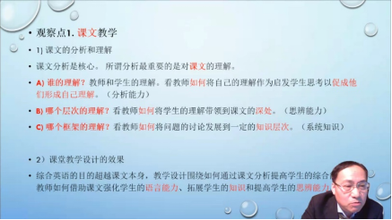 在说课案例分析环节,曲卫国教授指出,以课文为主要抓手的综合英语课程中,课文的分析和理解和基于理解以相关知识为基础的拓展是整个教案设计的核心。应当主要考虑词汇、知识、课文的信息结构、课文的认知框架四个层次。