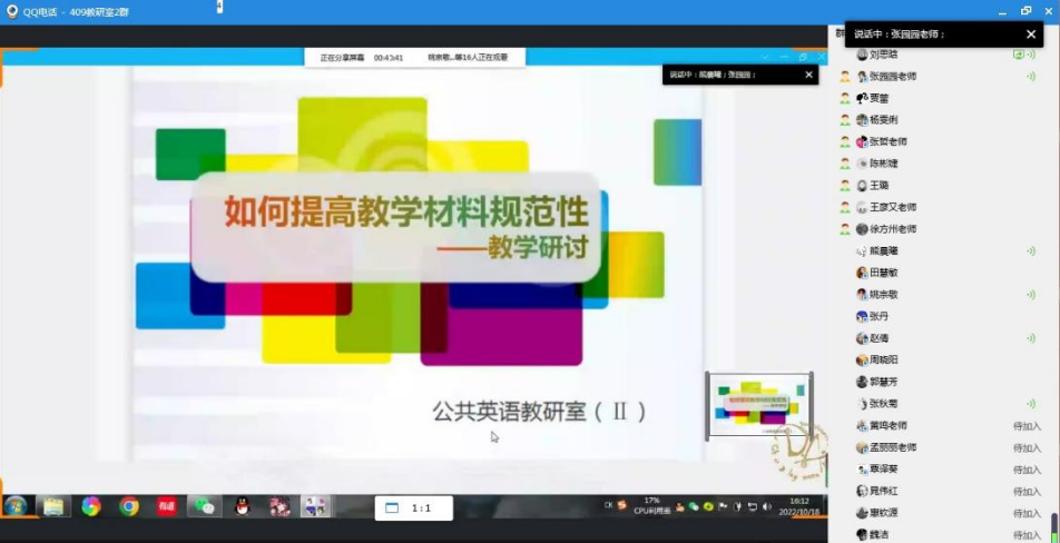 为保证教师教学水平,进一步改进完善教师教学工作规范性,公共英语教研室(II)于10月18日下午14:30-16:30组织全体教研室教师积极开展教师观摩课与教学研讨活动,旨在促进老师们互相学习,不断进步。