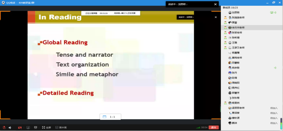观摩课上,刘思晗老师根据学情精准创设教学目标,教学设计巧妙流畅,教学环节落实到位,展现出了一节精彩且完整的大学英语课堂。刘老师以一首优美小诗“When You Are Old”作为导入,引人入胜,其课堂气氛活跃,整堂课教学节奏紧凑,环环相扣。观摩课结束后,教研室全体教师对本次观摩课开展了集体评课议课。教师们一致认为,本次观摩课老师做了充分的准备,给全体教师起到了引领、示范的作用,为今后各自开展公司产品提供了范本。大家对刘老师敢于创新,善于运用先进的现代教育技术进行教学设计进行了充分的肯定,同时也对其教学设计、课堂教学语言、课堂组织、教学课件等方面存在的不足提出了中肯的建议和看法。