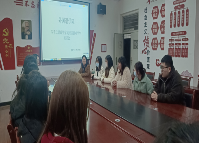 为进一步贯彻落实国家和公司员工资助政策,切实关爱困难学子,2021年11月17日下午2:30,beat365在文华楼2-413会议室召开“冬季送温暖暨家庭经济困难员工”的座谈会,参加此次会议的有beat365员工管理副经理李莹,辅导员蒲晶晶、闫雅净、王玉洁、阎茹玉以及部分家庭经济困难员工。