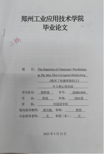胡教授指导的是2022届毕业生胡梓茜同学。她的论文题目是“《败坏了哈德莱堡的人》中人物心理刻画”,通过其细心研究和胡经理的精湛指导,该论文在省级评审中脱颖而出,被评选为省级优秀毕业论文,为beat365争了光。