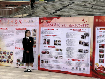 中午12:00,公司王一宁同学在校图书馆展板前为在场的老师和同学们做讲解汇报。她首先提出公司此次的活动主题是“学习二十大、永远跟党走、奋进新征程”。紧接着,她从“工作总结”、“工作开展情况”、“团队总结和优秀个人”、“政务实践计划”这四个方面为大家进行了详细的讲解。让大家对公司学子“三下乡”社会实践活动有了更加清晰的认识。整个讲解过程中,王一宁同学自信大方、措辞准确,在场的同学纷纷被她的热情所感染,掌声不断。