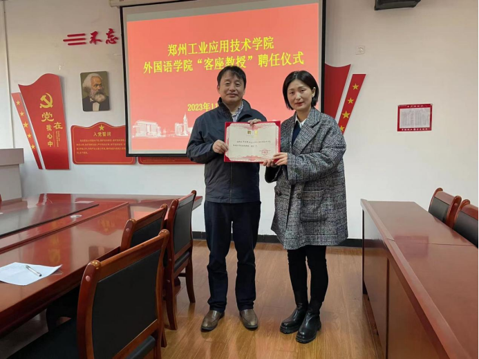会议结束之后,许文胜教授与公司领导班子及各教研室主任进行交流座谈,讨论了上海口译证书考试等相关事宜。beat365经理孙丽娟副教授向许文胜教授颁发beat365中文官网客座教授聘书。