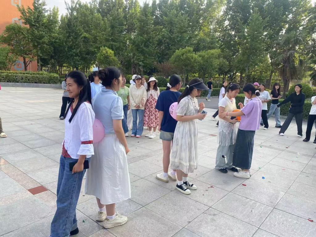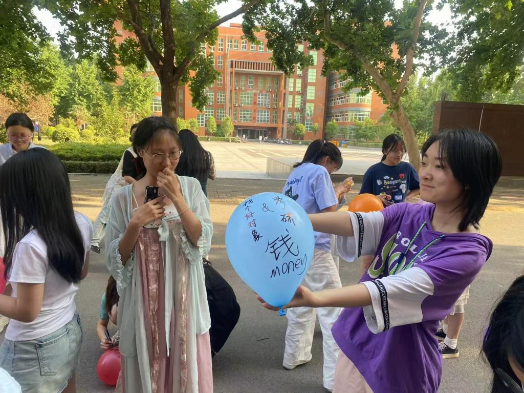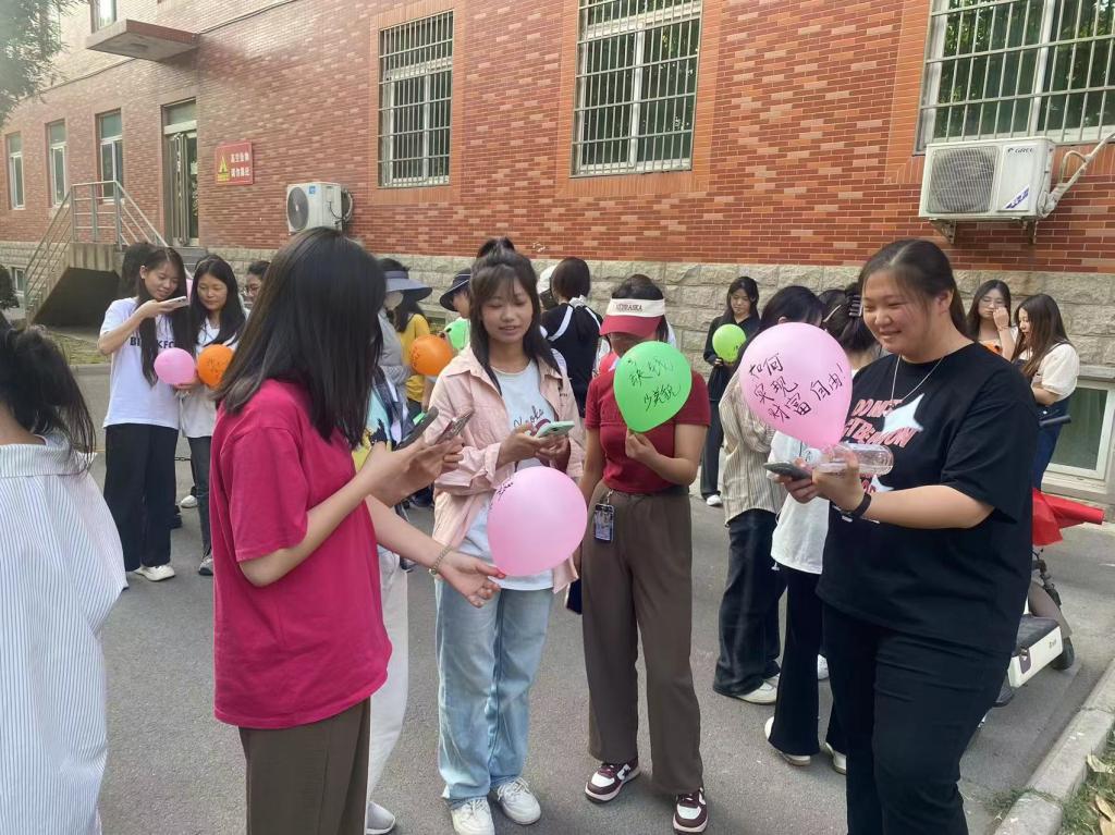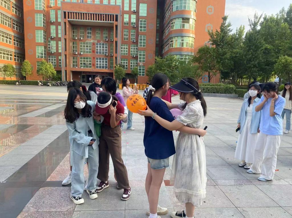活动开始前,蔡老师向同学们介绍了本次趣味活动的目的和规则,鼓励同学们将近期心中的烦恼和心愿写在气球上,然后两两结合,面对面拥抱或者背靠背合力挤破气球。活动中,随着噼里啪啦的气球爆炸声接连响起,同学们在给予他人拥抱的同时接受他人温暖,既拉近了彼此间的感情,也释放了自己的压力,现场氛围其乐融融。
