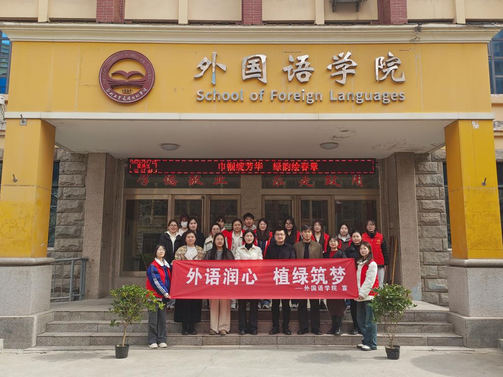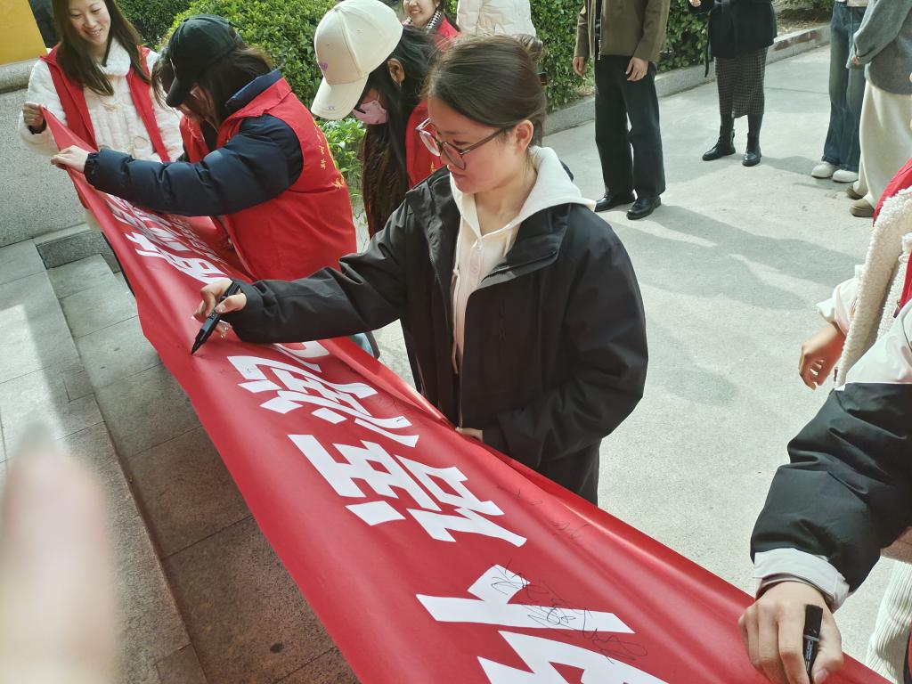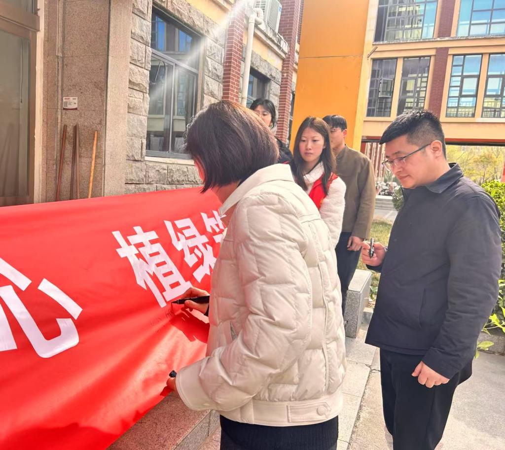 活动现场摆放着“外语润心植绿筑梦”的横幅,师生们热情高涨,纷纷拿起笔签下自己的名字,表达对绿色环保事业的支持。