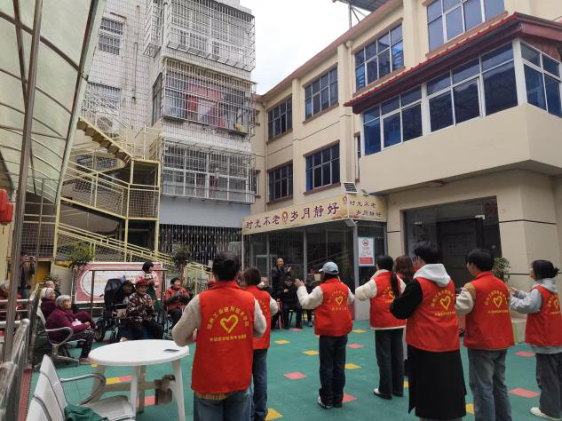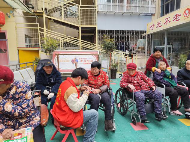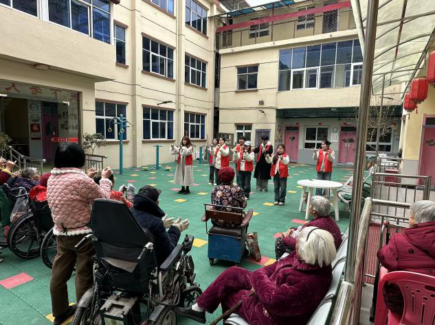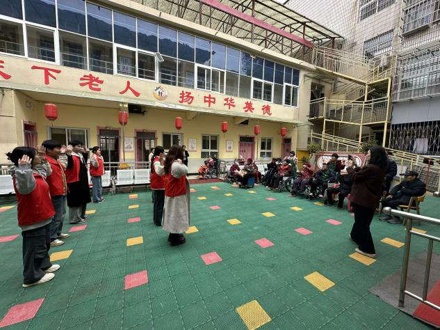 紧接着,同学们为老人们送上了精心策划的文艺表演。一曲慷慨激昂的歌曲在养老院内回荡,那青春洋溢、朝气蓬勃的歌声,仿佛唤醒了老人们对往昔峥嵘岁月的回忆,不少老人也不由自主地随着节奏轻声哼唱,沉浸在美好的回忆之中。随后的互动环节——“拍手操”,更是将现场气氛推向了高潮。同学们拉着老人们的手,耐心地教他们做动作,大家整齐划一地拍手、跺脚,欢声笑语与热烈掌声此起彼伏,整个养老院洋溢着温馨和谐的氛围。