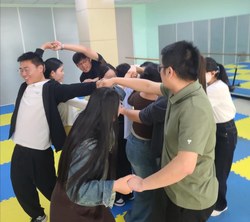 首个活动“心有千千结”拉开序幕,老师们手拉手围成圆圈,随机走动打乱顺序后,在不松开手的情况下,通过钻、跨、绕等方式,齐心协力解开“人结”。过程中,大家时而眉头紧锁思索策略,时而默契配合调整位置,现场充满欢声笑语。这个活动不仅考验团队协作能力,更让老师们体会到面对复杂问题时,保持冷静与积极沟通的重要性。