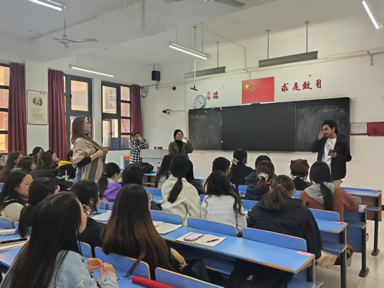 任园园、熊晨曦、Lidiia、Vlad cucu四位指导老师全程积极参与互动,不仅对同学们的英语表达进行点评,纠正发音、语法等问题,还对同学们的观点进行拓展和深化,引导大家进行更深入的思考。老师们丰富的知识储备和专业的指导,让同学们受益匪浅。活动中还穿插了互动问答环节,同学们积极提问,老师耐心解答,现场气氛十分活跃。