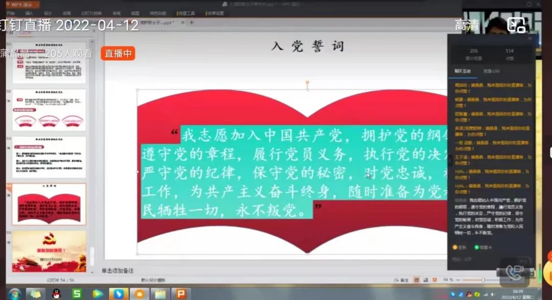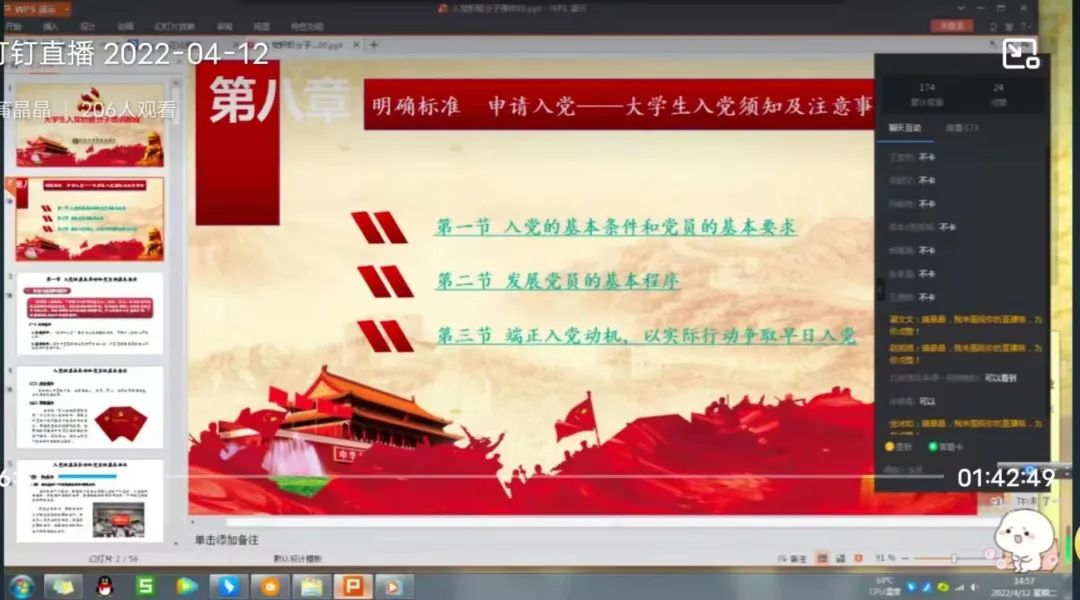 首先,蒲晶晶同志先给入党积极分子普及了入党的基本条件和党员的基本要求,让入党积极分子知道了入党必须满足国籍、年龄、身份、思想和行为这几个基本条件。随后,蒲晶晶同志通过播放视频“做合格党员”,让入党积极分子更加深刻了解到在日常学习生活中应该如何发挥模范带头作用。接下来,蒲晶晶同志给入党积极分子讲解了发展党员的基本程序并告诫他们要端正自己的入党动机,自觉接受党组织的考验。最后,蒲晶晶同志鼓励入党积极分子要敢于担当和作为,以实际的行动争取早日入党。