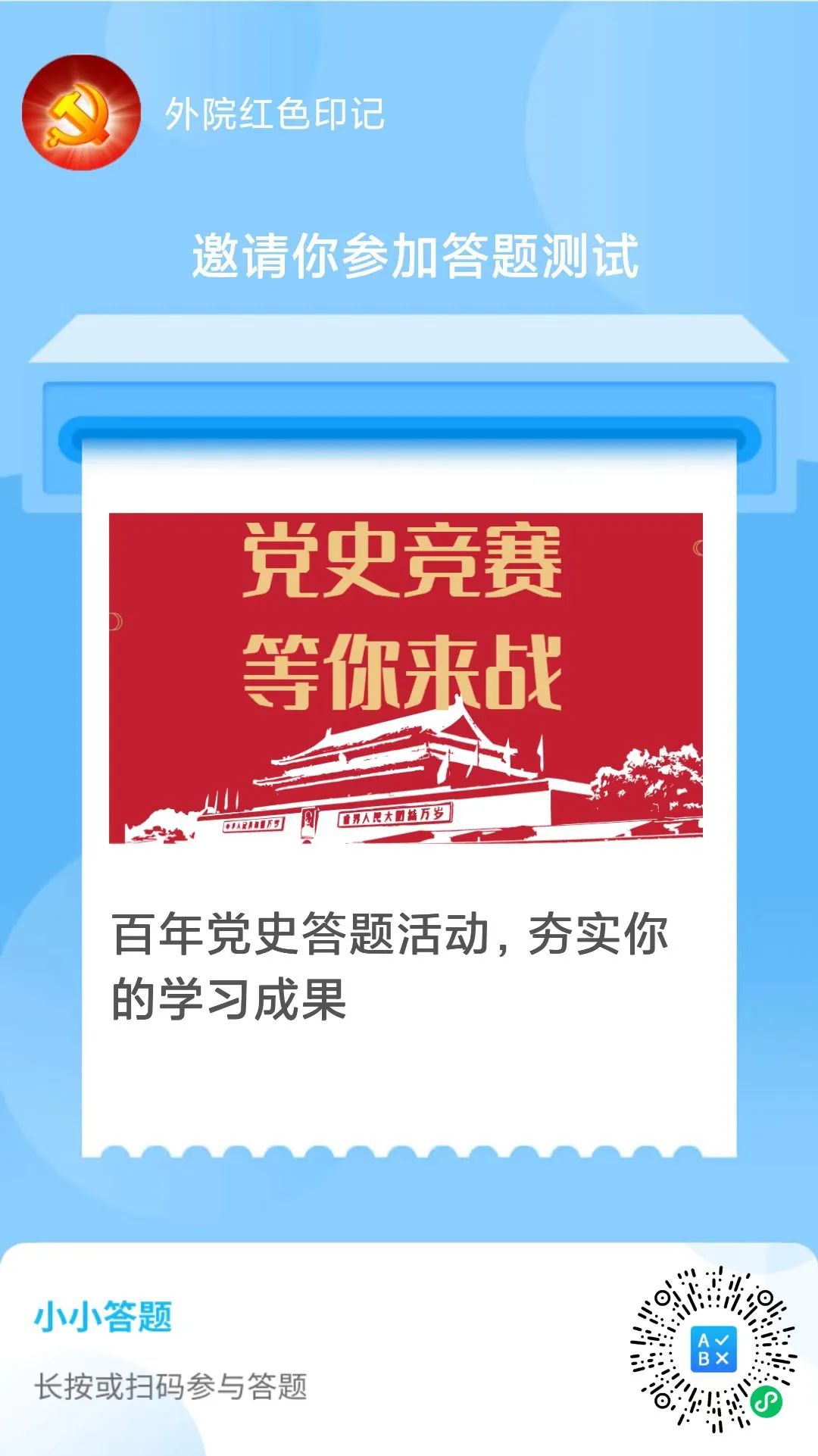 百年征程波澜壮阔,百年初心历久弥坚。党史是宝贵的精神财富,是每名党员奋进新征程最好的教科书。全体党员要认真学习党的历史,从中汲取营养、获得力量,勇于承担起新时代的历史使命。让我们一起从党史中汲取智慧,在竞赛中感悟力量!