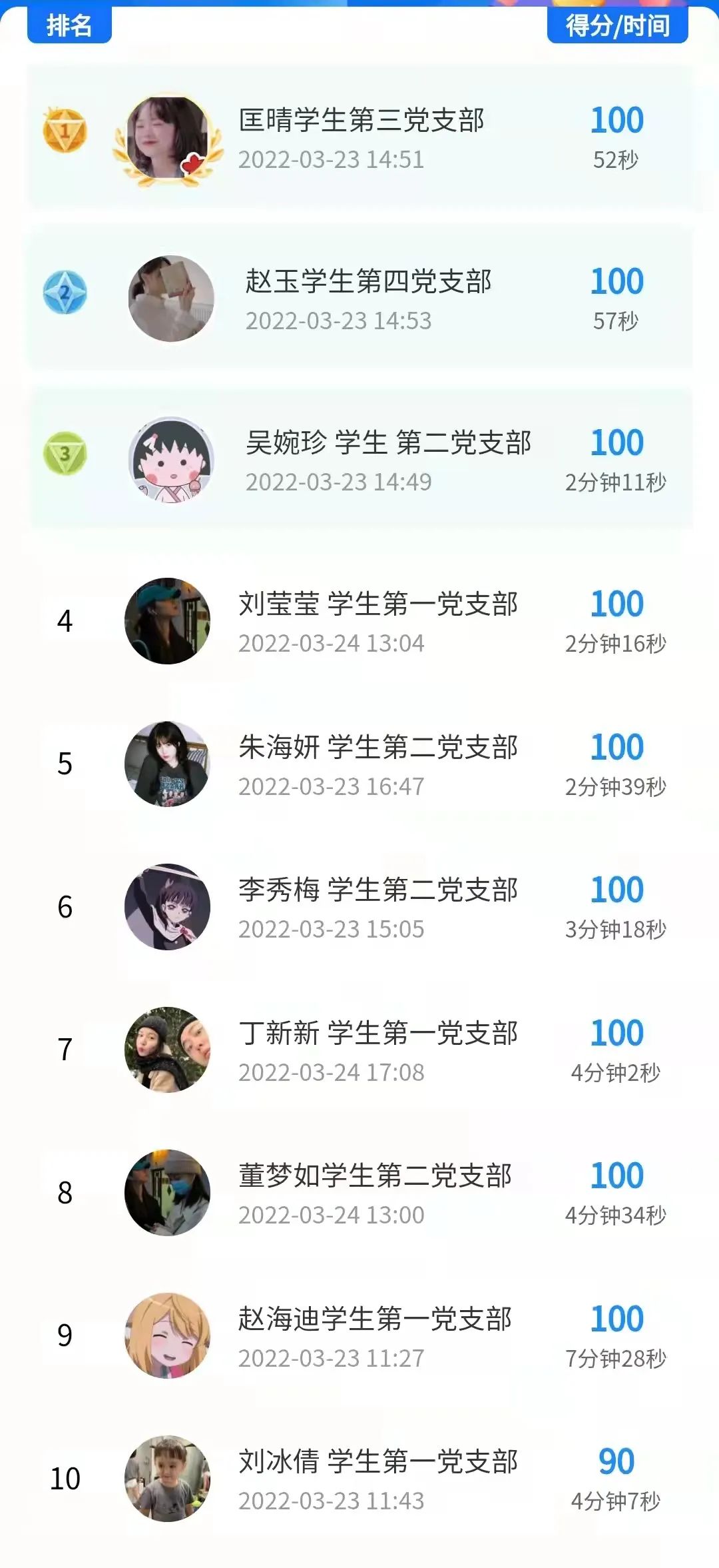 现将本次党史竞赛知识竞赛排名前十榜单公布如下: