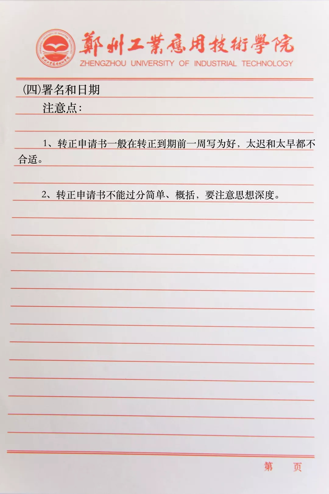 4、写明自己对待转正的态度,如不具备条件,不能按时转正的,自己应该抱有正确的态度。