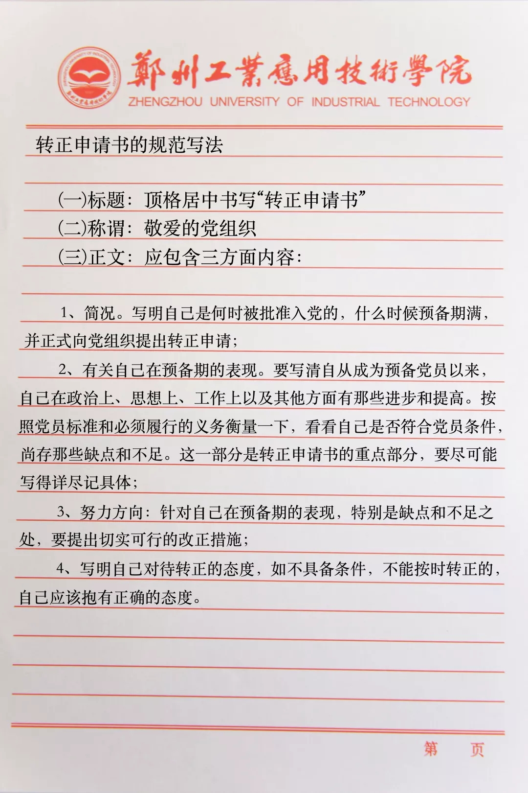1、简况。写明自己是何时被批准入党的,什么时候预备期满,并正式向党组织提出转正申请;