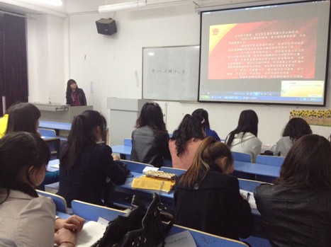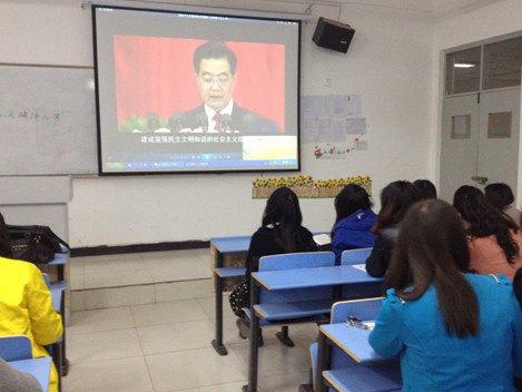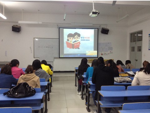 为了庆祝党的第十八届全国人民代表大会的胜利召开,学习贯彻党的方针政策,鼓励大家积极向党组织靠拢。2013年4月12日,2011级商务英语班在WH-2-101教室观看《十八大精神学习主题片》。