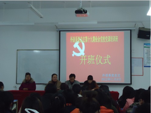 为了进一步做好入党积极分子的培养工作,加强入党积极分子队伍建设,根据公司党委工作计划安排,结合我系实际情况,外语系党总支于2012年11月8日12点10分在文华楼2-215教室举行了第十九期业余党校培训班开班仪式。