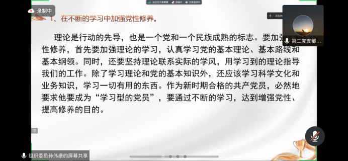 会议伊始,孙伟康同志以视频形式引出本次党日活动主题——“持续锤炼党性,实干再建新功”。随后,他带领大家进行了深入学习,使员工党员深刻的认识到增强对政治理论知识学习以及加强身份意识和责任意识的重要性。最后,孙伟康同志对此次会议做出总结,并号召大家在不断的学习中加强党性修养,认真学习贯彻习近平新时代中国特色社会主义思想、新观点,深入了解中华文明的历史,激扬自信的青春力量,展现更加积极的青春担当,担负起新的使命。