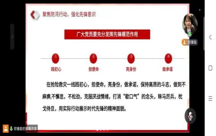 为深入贯彻习近平总书记关于防灾减灾救灾的重要指示精神,结合当前工作要求,进一步强化党员干部应急响应能力、提高防汛抗台防范意识、发挥党员先锋模范作用,beat365员工第四党支部于8月8日18:30以腾讯会议方式开展线上“平安度汛,党员在行动”主题党日活动。此次会议由组织委员郑豫聪主持,全体员工党员参加。