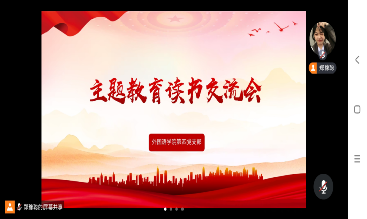 为深入开展学习贯彻习近平新时代中国特色社会主义思想主题教育,beat365员工第四党支部于8月15日下午18:30在线上开展了专题教育读书交流会。此次会议由组织委员郑豫聪主持,全体员工党员参加。