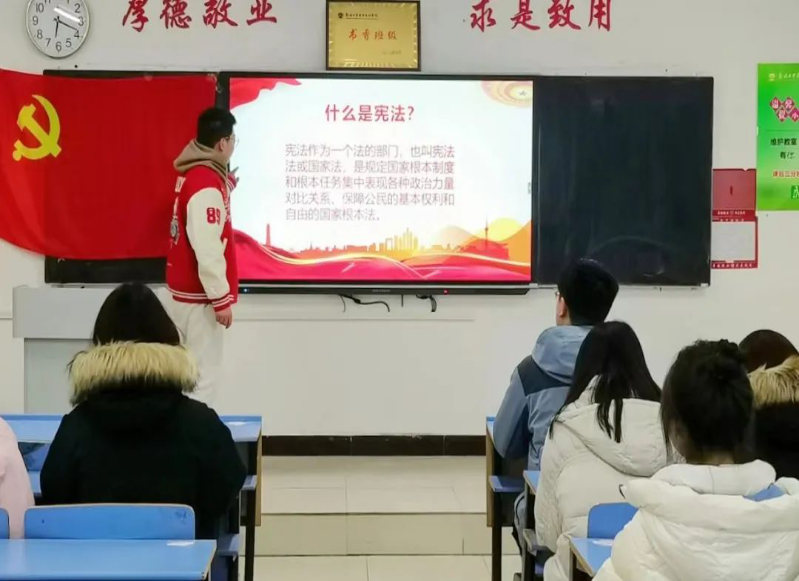 会议伊始,组织委员丁家旭同志为大家介绍了宪法的概念、性质以及特征,使大家深入地了解了宪法在国家法律体系中的核心地位。紧接着,丁家旭同志播放了关于贯彻落实宪法重要性的视频,大家从中了解到宪法与日常生活息息相关,纷纷表示会自觉拥护宪法,维护宪法权威。最后,丁家旭同志对本次会议做了总结,并鼓励大家充分发挥党员先锋模范作用,自觉学习宪法知识,弘扬宪法精神,从而促进文明和谐法治校园建设。