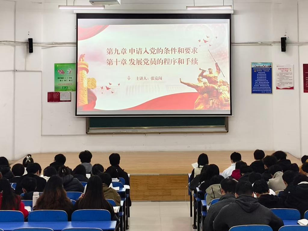 张克闯同志的讲解逻辑清晰、重点突出,将“年满十八岁的先进分子”等入党条件阐释得精准明确,把“申请入党、积极分子培养、发展对象确定、预备党员考察、正式党员转正”的全流程拆解得细致入微。接着他结合生动案例,把原本严谨的程序知识讲得深入浅出、引人入胜,既保证了内容的专业性,又极具感染力,让积极分子们对每一项手续都有了深刻理解。