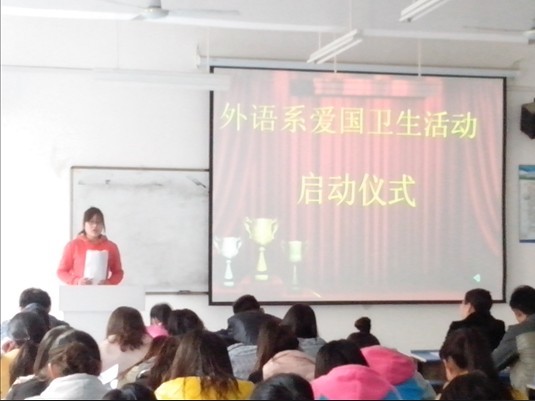 2013年4月10日在文化楼2-102,外语系举行了“爱国卫生活动月启动仪式”。出席此次启动仪式的领导老师有:外语系党总支副书记主任助理李爱萍,辅导员陈磊、陈晴、王丹老师,以及外语系全体团学会成员、入党积极分子、各班班长、寝室长等。