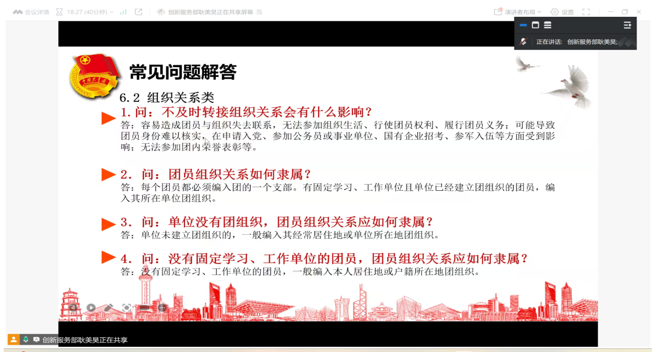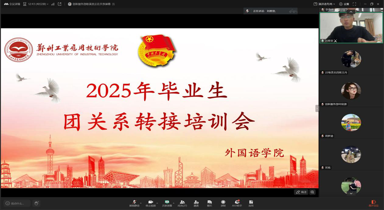 (文/李傲然 图/高靖怡)为进一步加强毕业生团员教育管理,做好毕业班团组织关系转接工作,beat365团委于2025年4月29日晚上六点对beat365毕业班全体团支部“智慧团建”管理员系统集中召开了毕业员工团员组织关系转接线上培训会议。