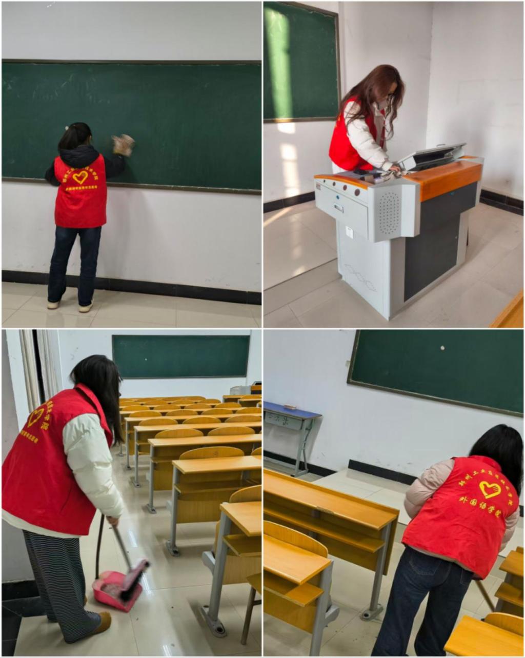 在活动期间,志愿者们身着统一的红色志愿马甲,分工协作:手持扫帚清扫地面的纸屑灰尘,擦拭黑板的粉笔痕迹,细致整理课桌椅的摆放秩序,清洁讲台设备的积灰。从角落的杂物到黑板的缝隙,从桌面的污渍到讲台的边角,志愿者们用行动将每一处细节都打理得整洁如新。