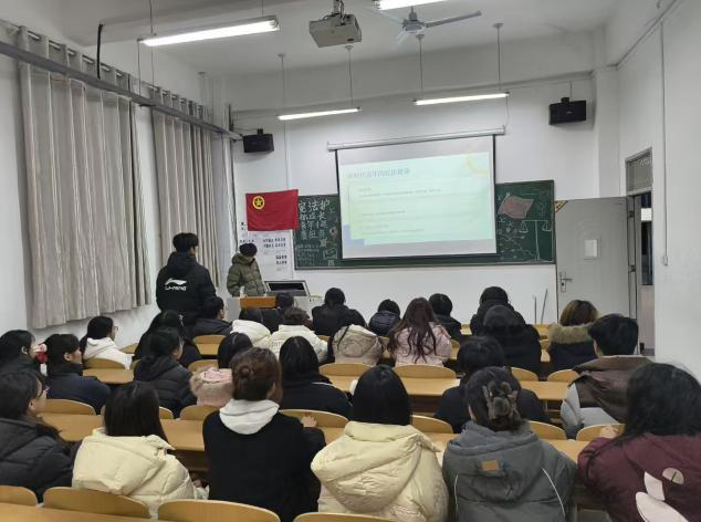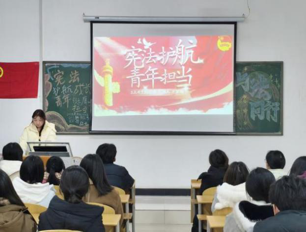 活动伊始,团支书带领大家唱响团歌。随后,团支书开始进行PPT讲解并播放宪法与青年相关的短视频,重点强调了宪法是立身行事和担当使命的根本遵循,同时阐明了宪法对于青年成长的根本保障作用,引发同学们的思考。