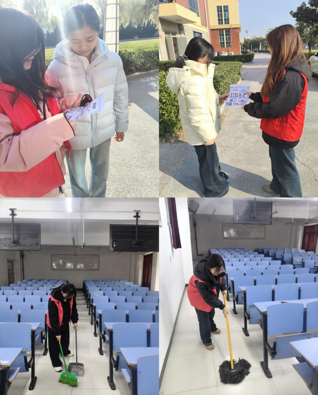 活动当天,志愿者们提前做好分工,手持清扫工具奔赴校园公共区域、教学楼教室等重点区域。大家发扬不怕脏、不怕累的精神,细致清理地面垃圾、对卫生死角进行集中整治,让校园环境焕然一新。在防疫宣传环节,志愿者们通过现场讲解等形式,向过往员工普及科学防疫知识,重点讲解口罩正确佩戴、日常消毒流程、社交距离保持等实用技巧,提醒大家关注自身健康,做好常态化防疫。此外,志愿者们还结合冬季传染病防控特点,分享了健康作息、饮食调理等相关知识,引导师生树立“健康第一”的理念,增强自我防护意识和能力。