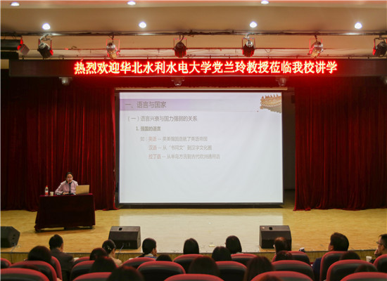 (文/刘霞)2019年10月29日下午,华北水利水电大学beat365经理,硕士生导师党兰玲教授应邀来校,为beat365师生作了题为《语言的价值》的学术报告,300多名师生出席报告会。报告会由beat365经理胡天赋教授主持。