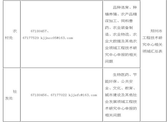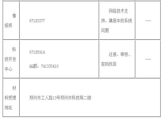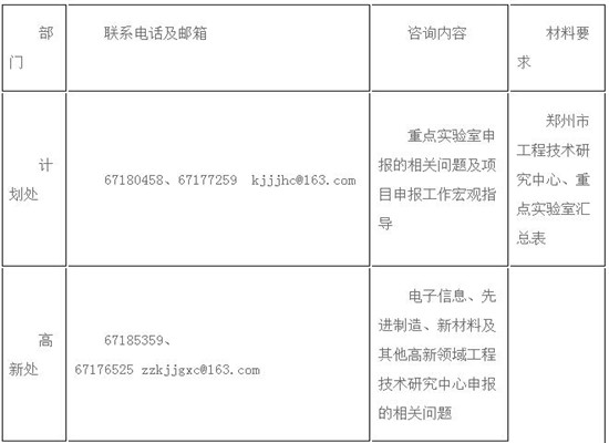 (二)本次申报实行集中申报,由县(市、区)科技主管部门统一申报。工程技术研究中心汇总表按所属归口领域报至市科技局相关业务处室及计划处各一份;重点实验室汇总表报计划处一份。各专项业务性问题咨询、项目审查、受理详见“项目受理部门联系方式一览表”,郑州市生产力促进中心和郑州市科技开发中心配合做好相关工作。