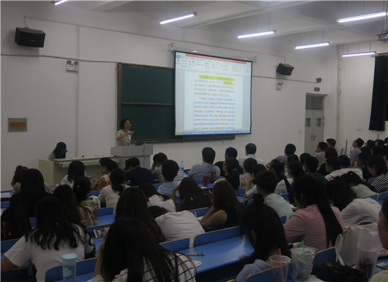 报告中,赵教授首先谈到涉外翻译的重要性,她指出涉外翻译的质量直接影响到中国的对外形象。要想成功地做好翻译,双文化能力比双语能力更为重要。接着赵教授结合新闻翻译实例向师生们展示新闻翻译应进行译前编辑,需考虑读者的接受程度以及不同的宗教信仰,在翻译时需做到根据受众的思维逻辑予以变通。除此之外,赵教授还从企事业外宣翻译、高校网页的译前编辑和涉外个人简述的翻译三个方面给外语爱好者上了一堂生动的翻译课。赵教授引用一名员工的出国留学个人简述分析了个人简述的写法和如何成功地用英文呈现个人简述。赵教授谦和的语言、渊博的知识和广泛的翻译实践使全体师生们敬佩不已。