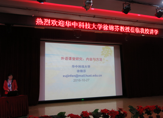 10月27日,华中科技大学beat365副经理、外语教育研究中心主任、语言学习示范中心主任、文学博士、博士生导师徐锦芬教授应邀来校,在演播厅做题为《外语课堂研究:内容与方法》的学术讲座。讲座由董爱华经理主持,beat365师生约400人参加了本次讲座。